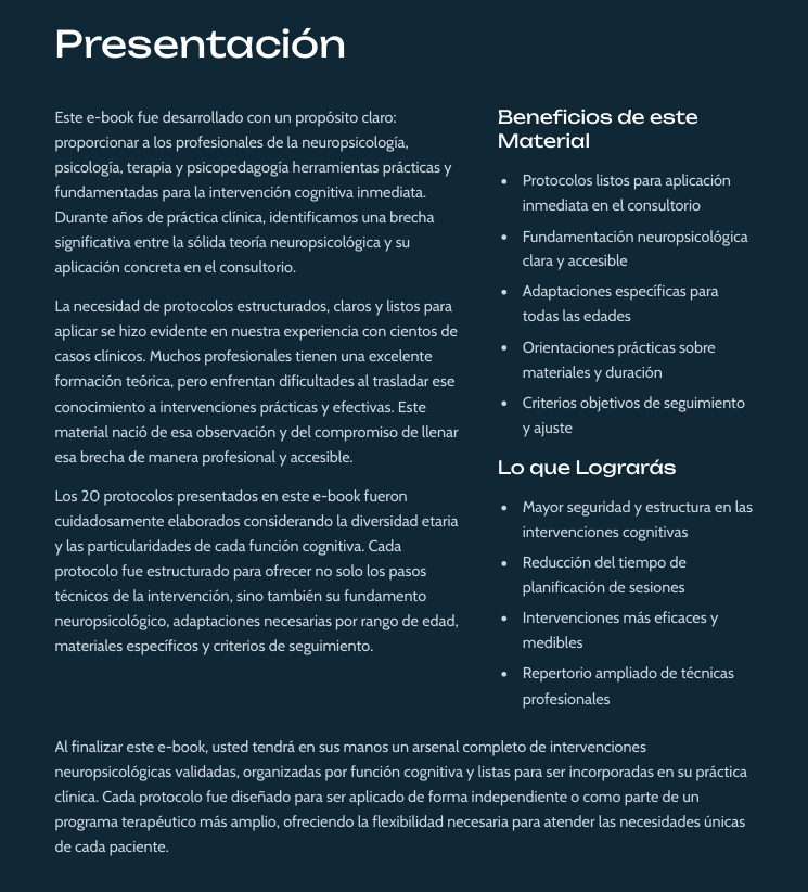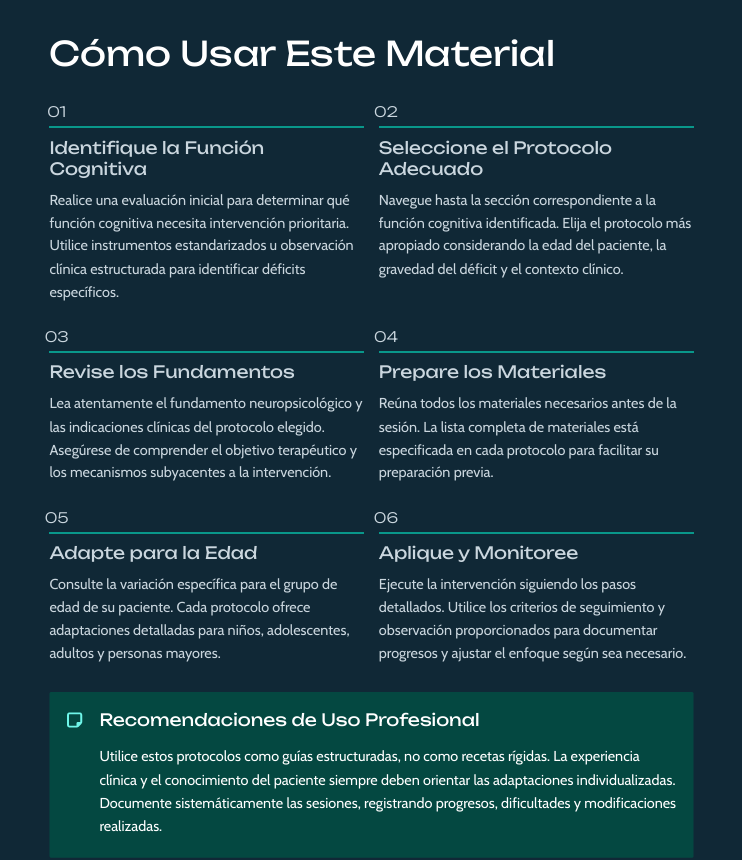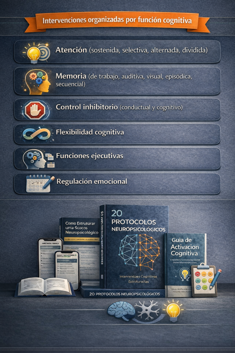 20 protocolos distribuidos en Atención, Memoria, Funciones Ejecutivas (inhibición, planificación, flexibilidad), Regulación Emocional