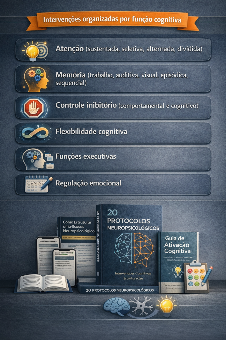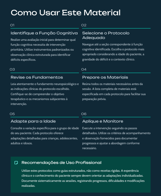 Apresenta o passo a passo para estruturar intervenções conforme a função trabalhada (atenção, memória, controle inibitório, flexibilidade cognitiva, etc.), desde a preparação até o encerramento da sessão. Funciona como apoio rápido para planejamento clínico.