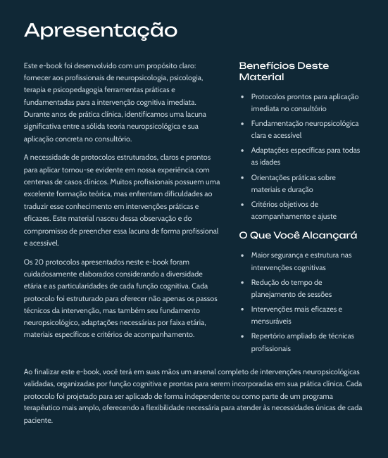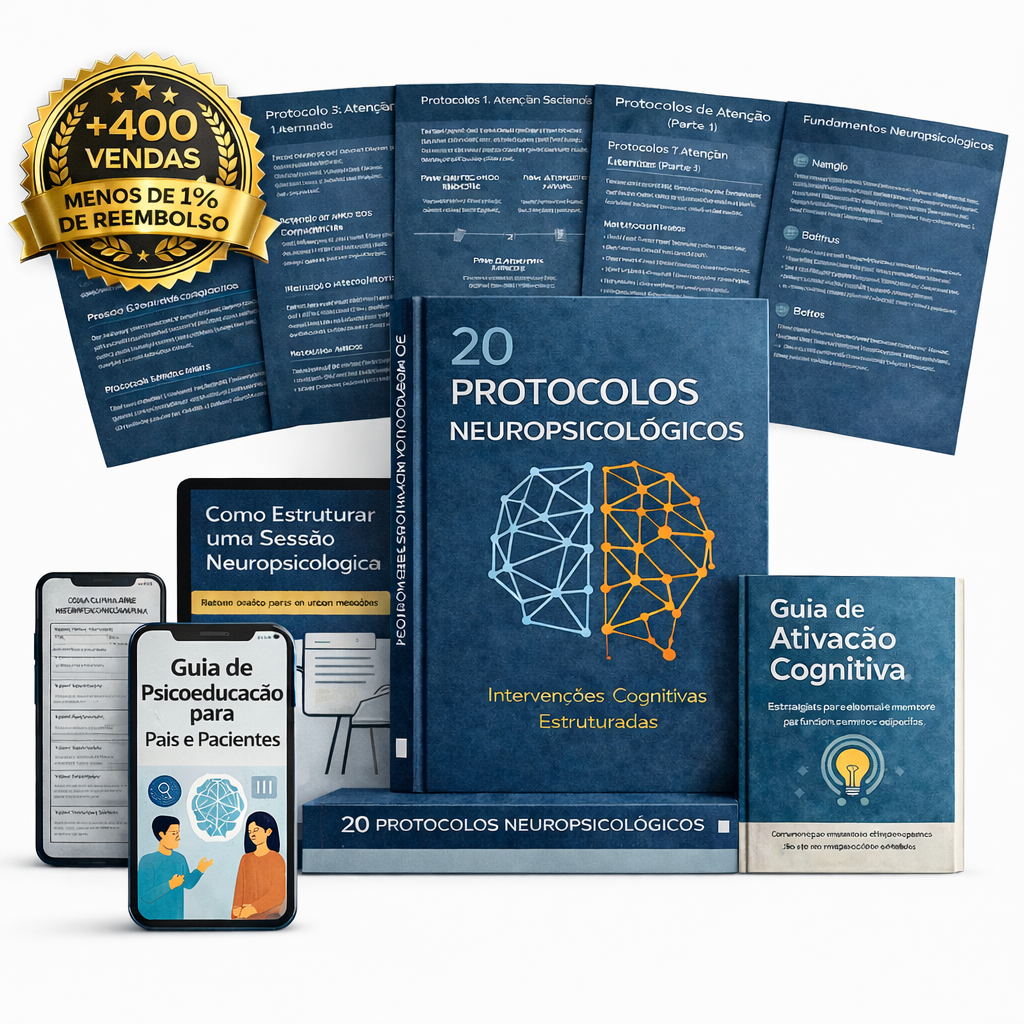 Todos esses materiais foram desenvolvidos para sustentar a aplicação prática dos 20 Protocolos Neuropsicológicos, oferecendo suporte à tomada de decisão clínica, ao acompanhamento dos casos e à comunicação com pacientes e famílias.
